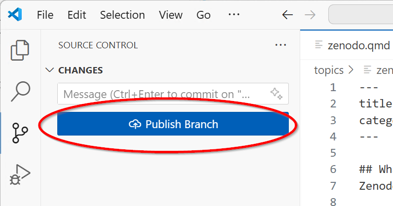 Remember your changes are tied to the branch. If you would switch from the zenodo_topic branch to the main branch you will no longer see the changes you made to the Zenodo topic page. But if you have committed your changes they will be visible again once you switch back.